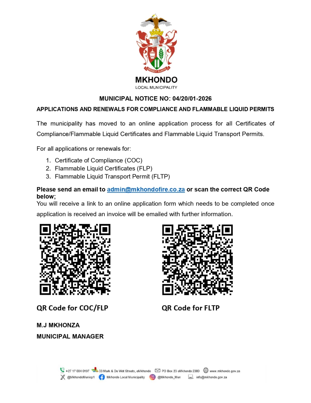 APPLICATIONS AND RENEWALS FOR COMPLIANCE AND FLAMMABLE LIQUID PERMITS – MUNICIPAL NOTICE NO: 04/20/01-2026