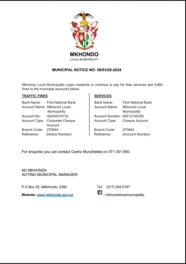 Mkhondo Municipality urges residents to continue to pay their services and traffic fines to the municipal accounts.