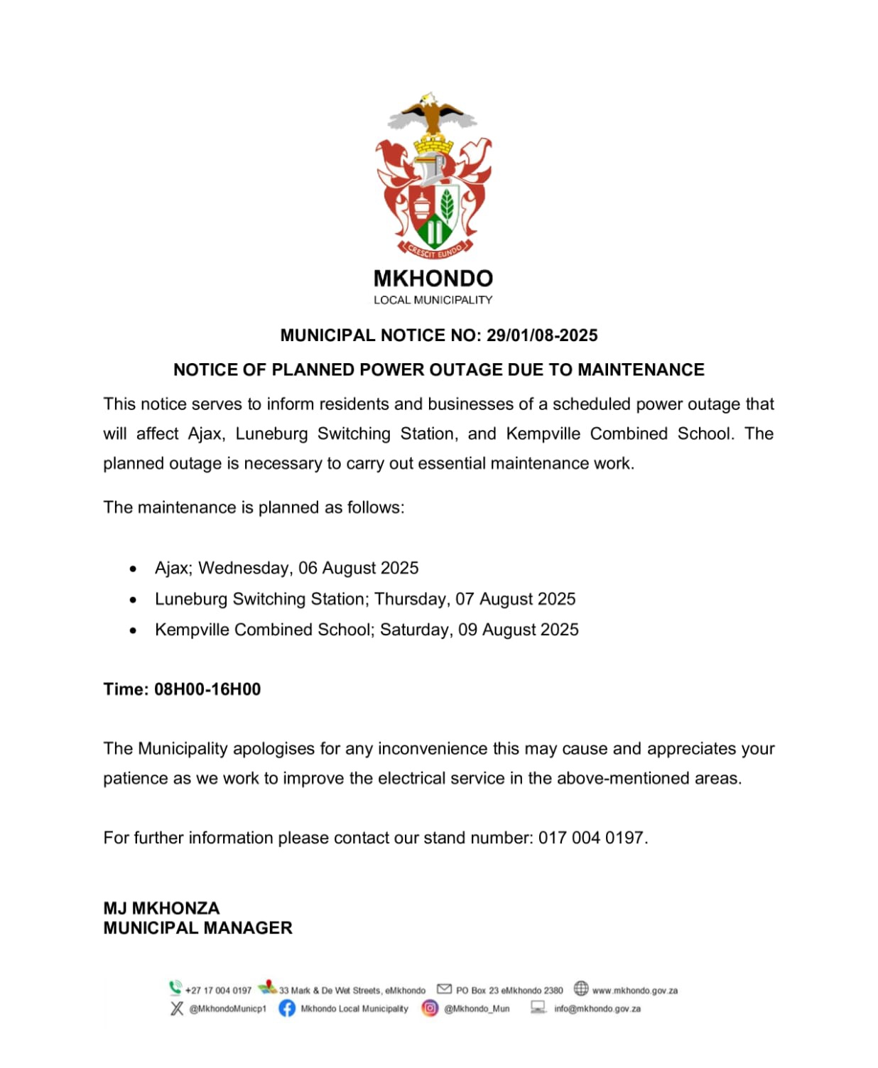 NOTICE OF PLANNED POWER OUTAGE DUE TO MAINTENANCE – MUNICIPAL NOTICE NO: 29/01/08-2025