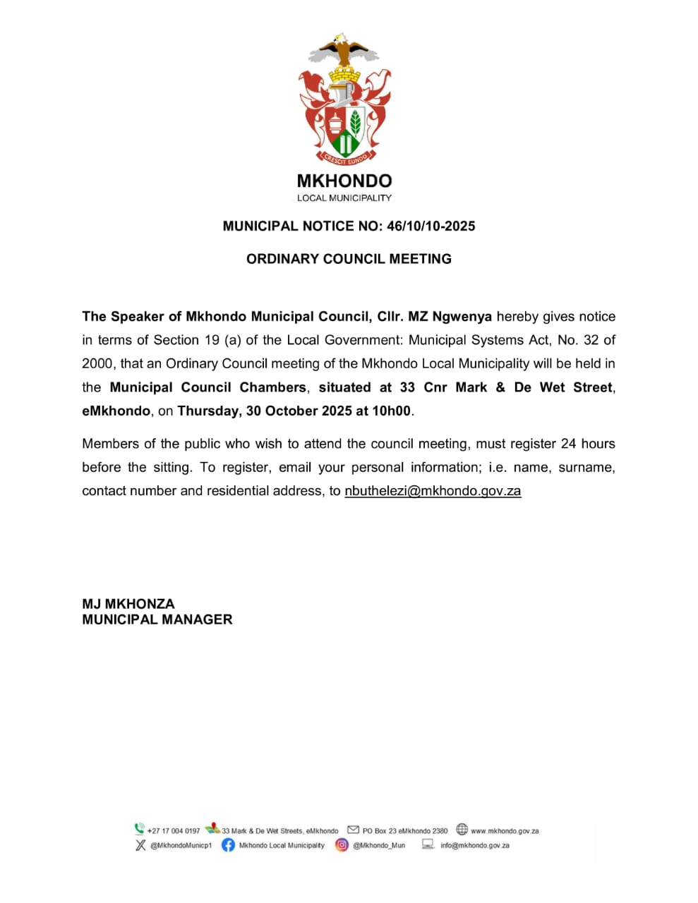ORDINARY COUNCIL MEETING – MUNICIPAL NOTICE NO: 46/10/10-2025