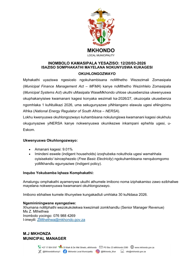 PROPOSED ELECTRICITY TARIFF INCREASE – MUNICIPAL NO: 12/20/03-2026