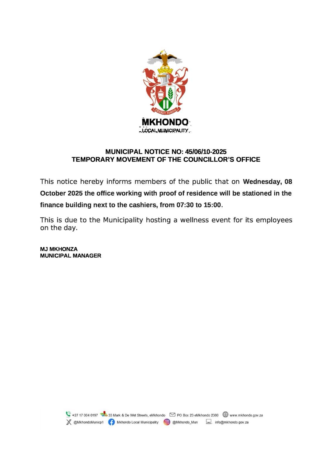 TEMPORARY MOVEMENT OF THE COUNCILLOR’S OFFICE – MUNICIPAL NOTICE NO: 45/06/10-2025