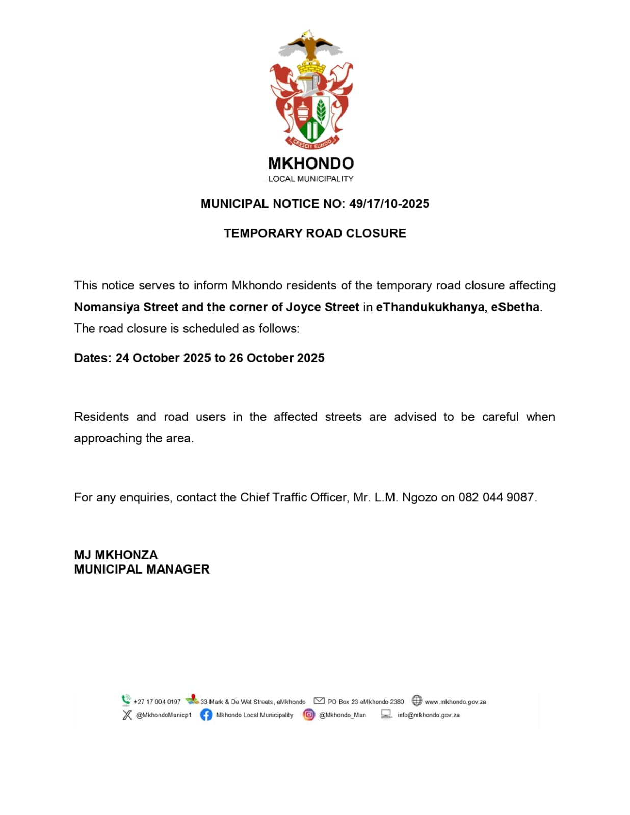 TEMPORARY ROAD CLOSURE – MUNICIPAL NOTICE NO: 49/17/10-2025