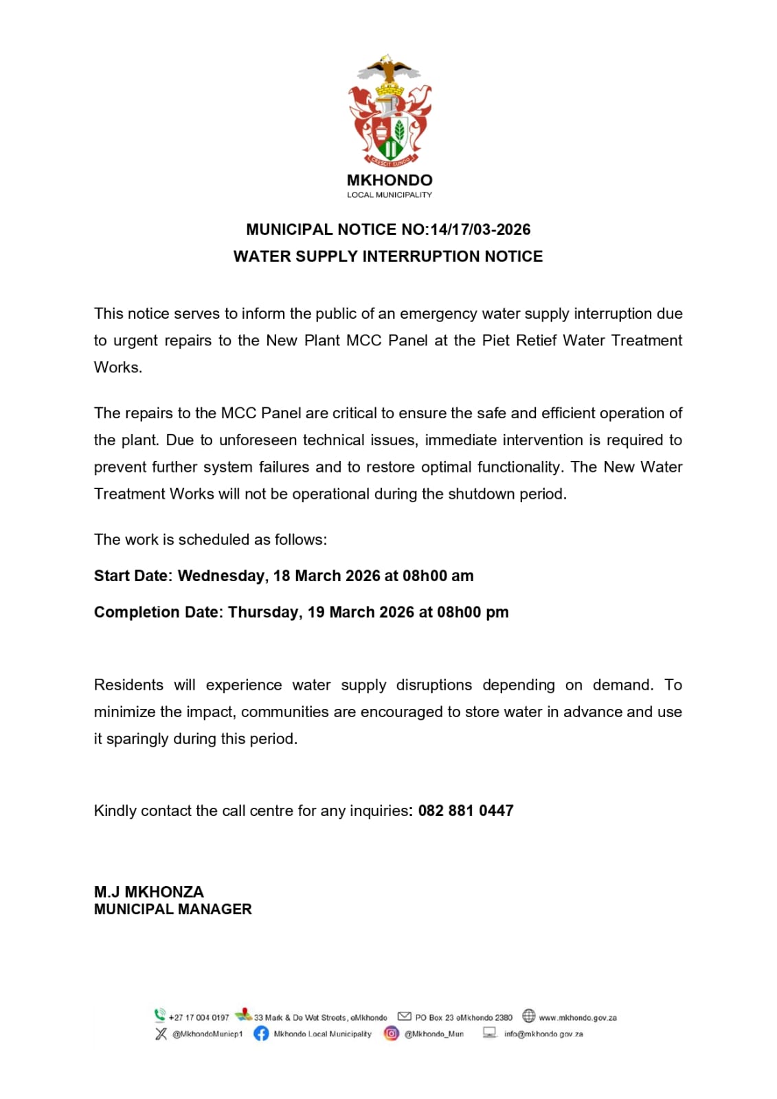 WATER SUPPLY INTERRUPTION NOTICE – MUNICIPAL NOTICENO: 14/17/03-2026